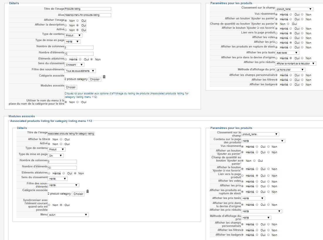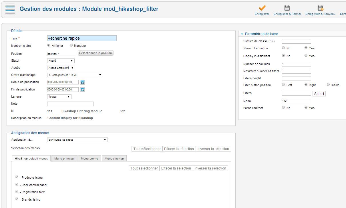 Here is 1 screenshot of the frontend and 2 screenshots of the admin pannel (Filter Module and HikaShop menu options).