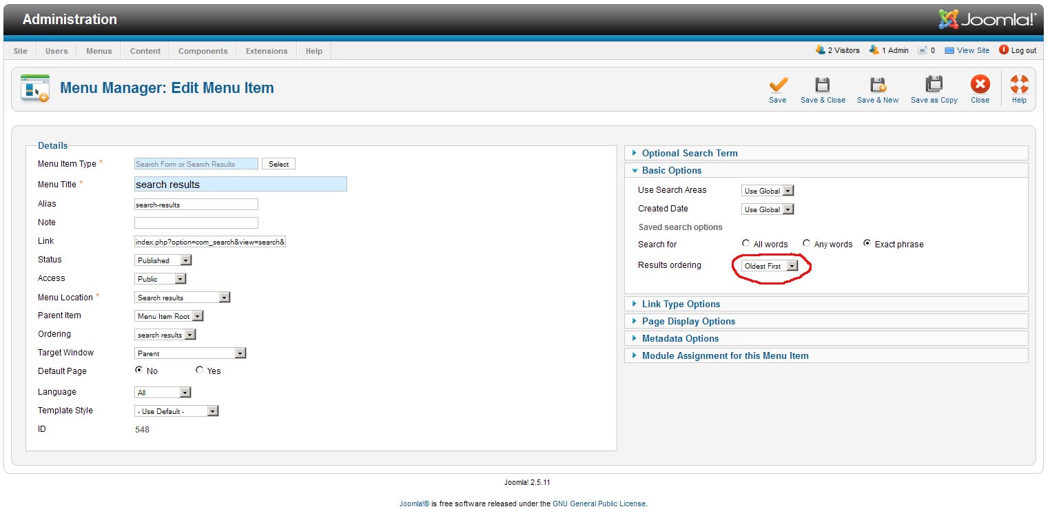 I am currently using "Search » Search Form or Search Results" menu item type and no matter what I change the setting to it still comes up in the same order.