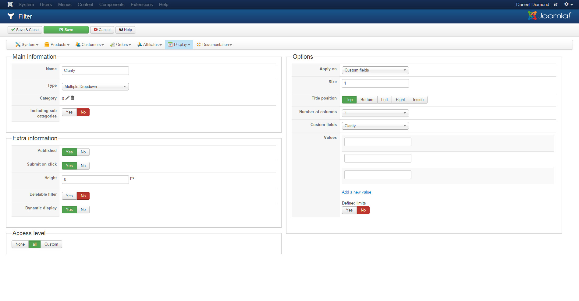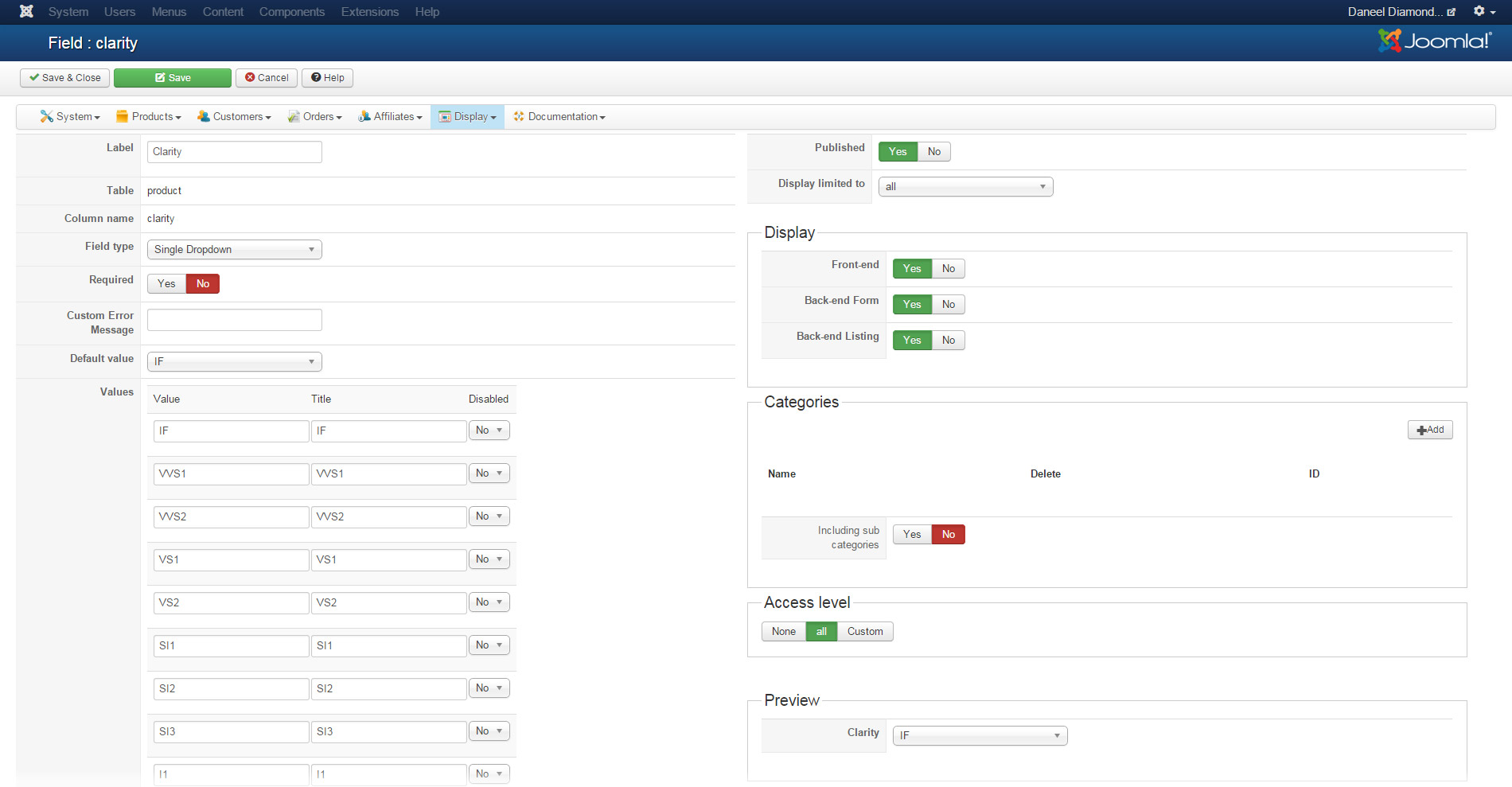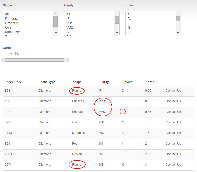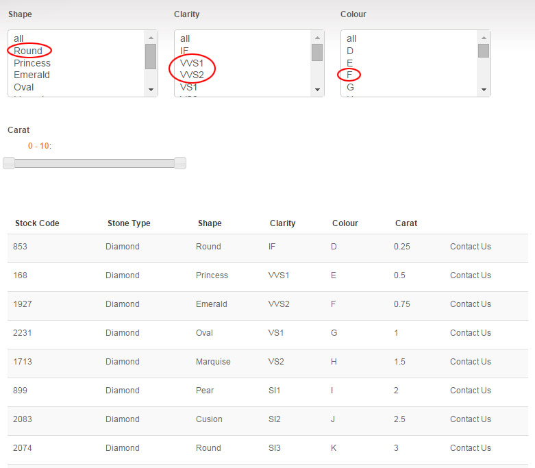 Front2: Dynamic display enabled. Here you will notice that the values Round, VVS1, VVS2 and F are missing from the selection boxes. There are however items in the list below that contains these values.