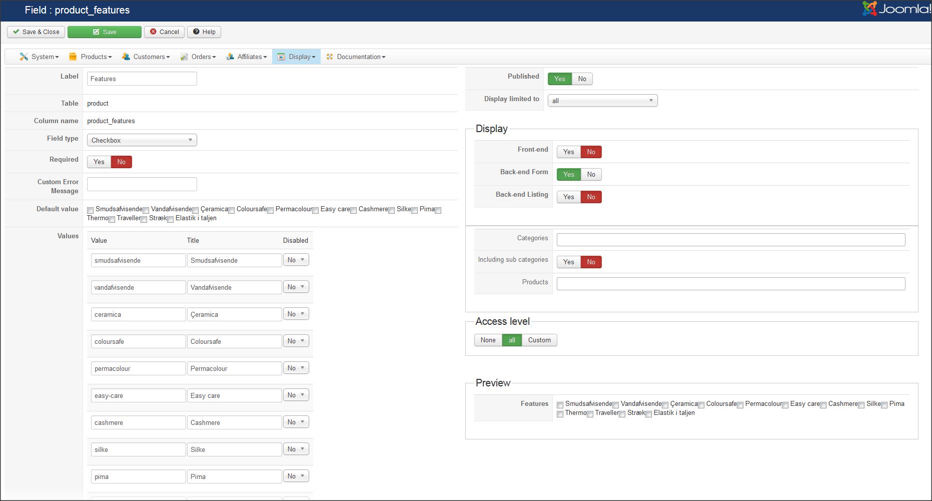 I have created a custom field called "Features" and populated the values like this: