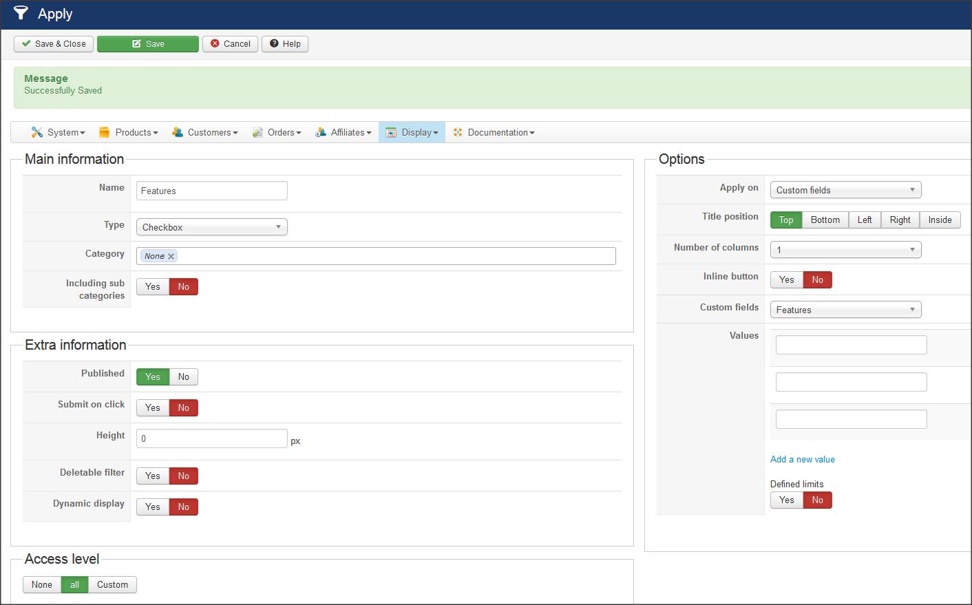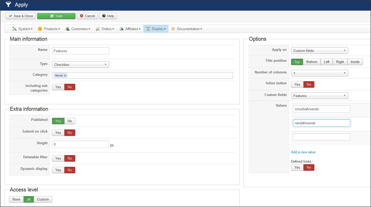 Here, you can see that the Values entered match the "Values" field from the custom field. In this example, I only want the filter to show 2 choices.