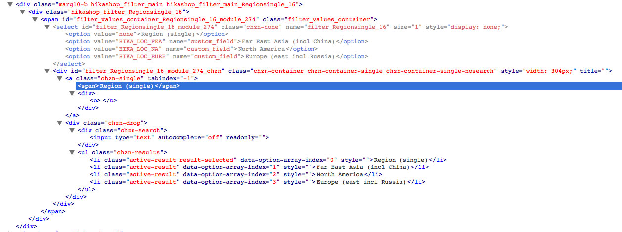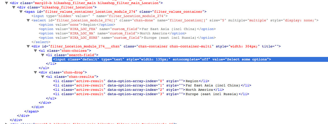 With the Chosen library enabled in HikaShop, I created two filters from the same custom field, one single, the other multiple dropdown. Please look at the different HTML and note the difference. I highlighted what is visible with dropdowns closed, and you see that for the single dropdown the placeholder was replaced by "Region (single)", and for the multiple dropdown it's not "Region" as should be, but it's still the default ("Select some options" as per Chosen JS):