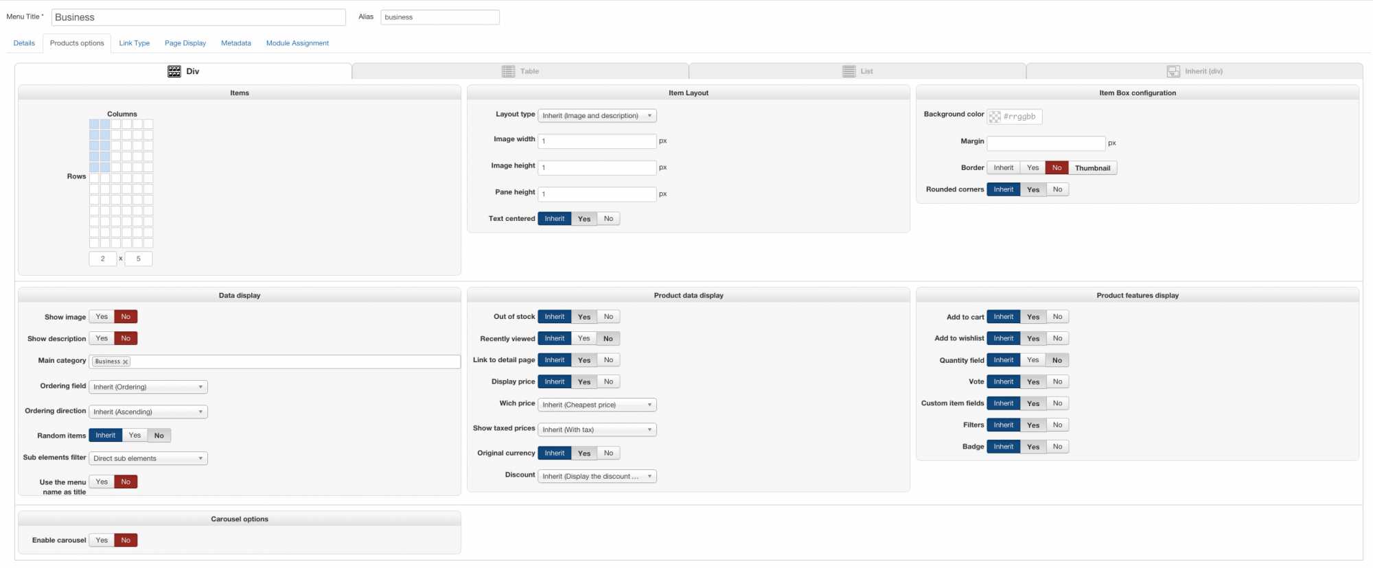 Could you provide a screenshot of the products options and of the categories options tabs of your menu item ?