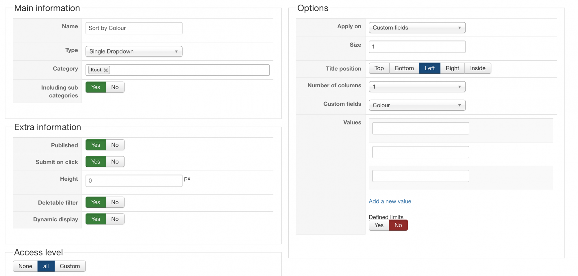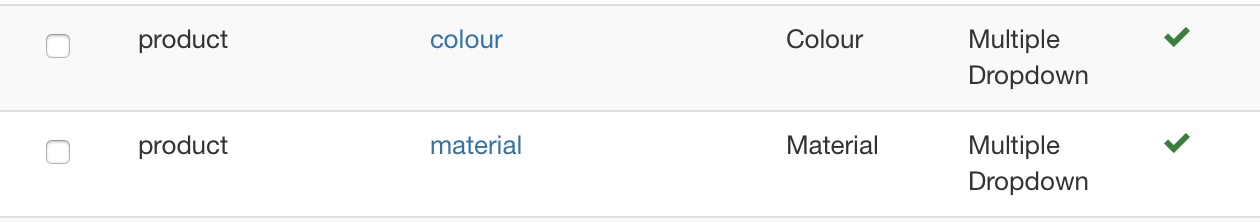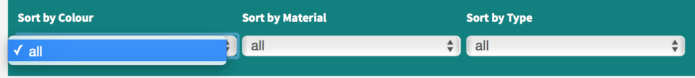 The drop down fields in the filter are not showing any products (see colour) or not all of them (see material) even though there is no filter applied and there are lots of products with the colours in the shop.