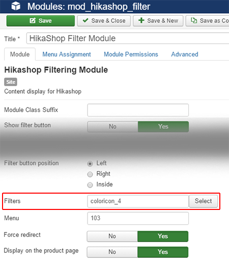 - IMAGE 1: my HIKASHOP filter module configuration. I set the MENU parameter with the menu id where is possible to see the filter