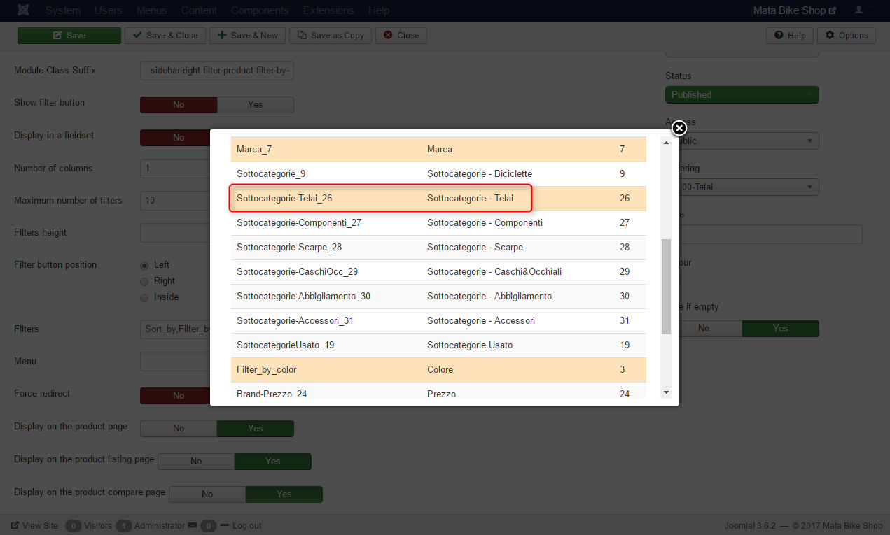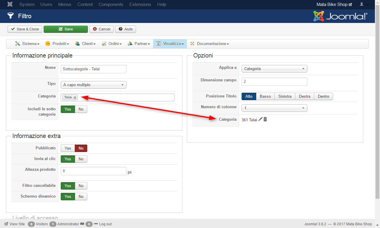 - IMAGE 3: the filter configuration. I create a filter called COLORE (=color in english); I set the category BICICLETTE, the same of the menu; the characteristic associated is COLORE (parameter on the right of the image), I included the subcategory;