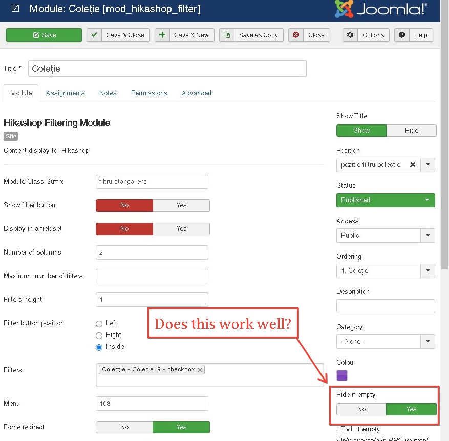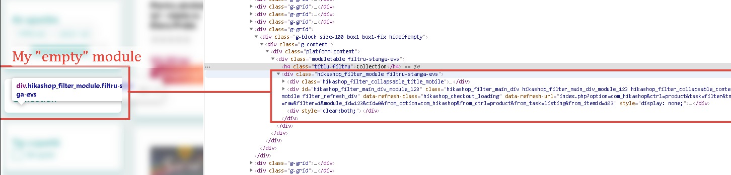 Because the module is not completely empty, and it have some hidden values this option is not working for module "mod_hikashop_filter", right?