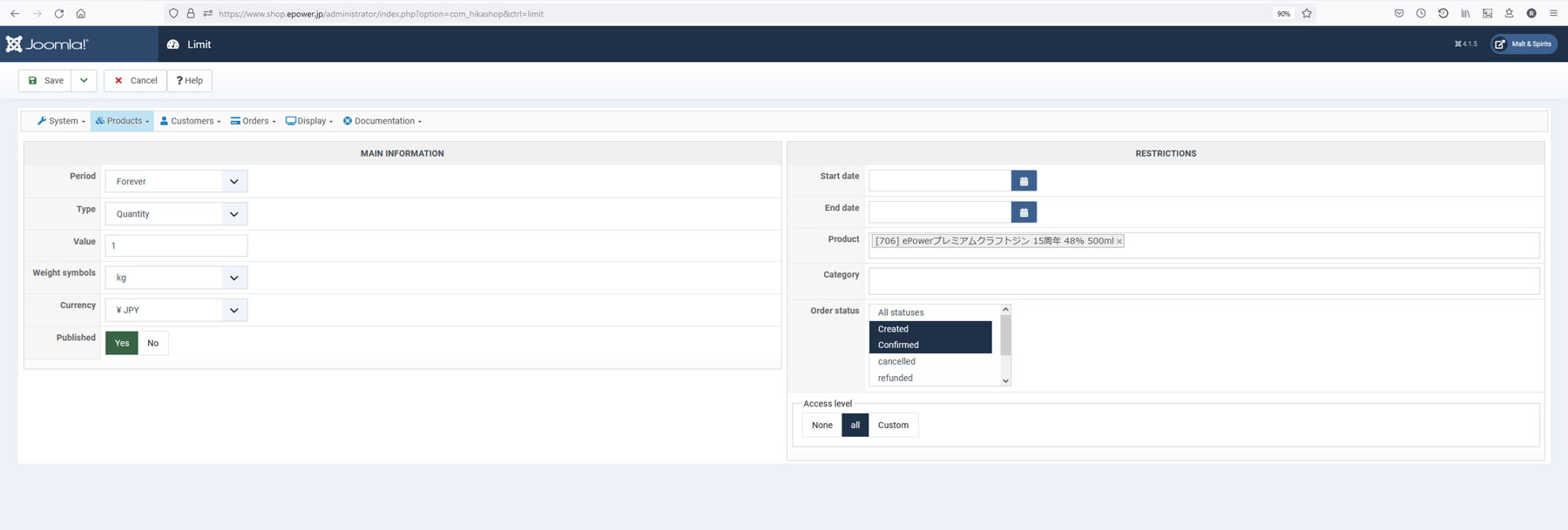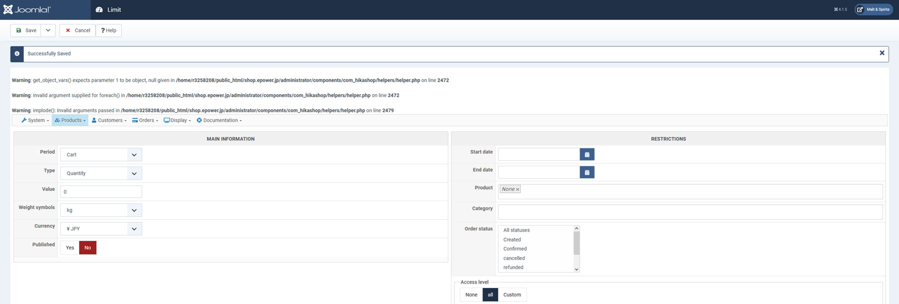 when inputing a limit in products then I get the following error messages.