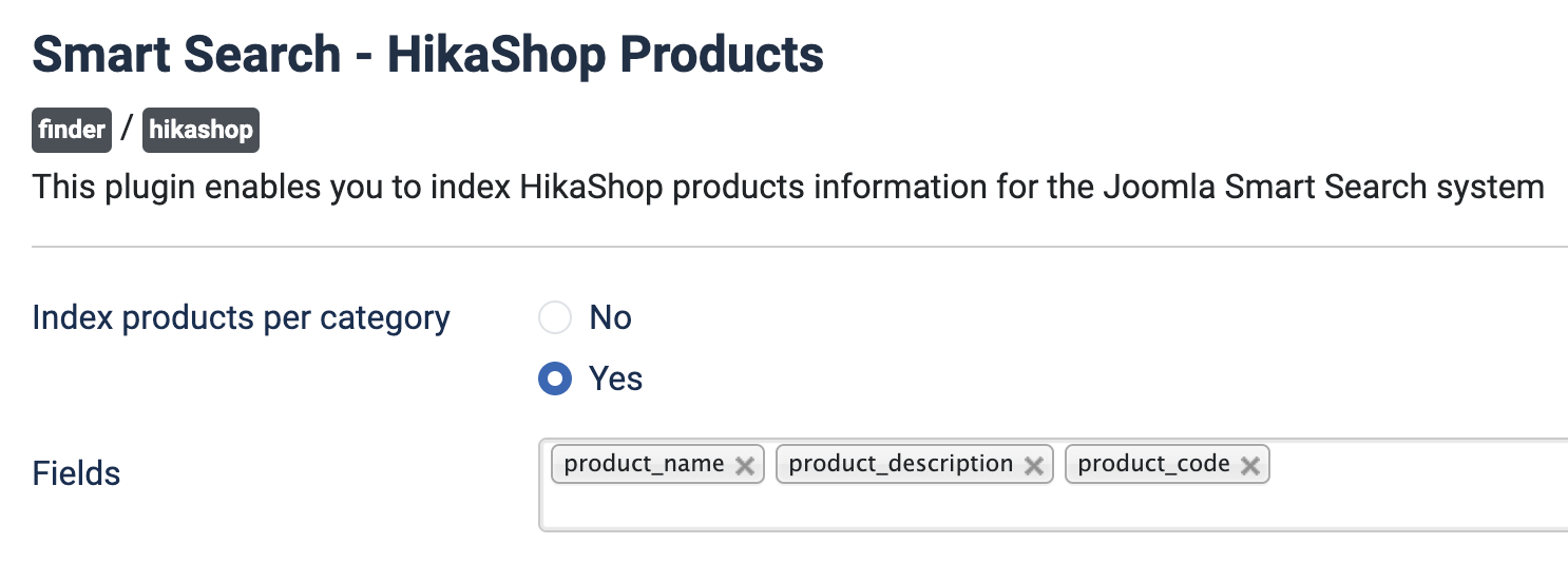 We've configured the Hikashop product search smart search plugin to search for product_name, product_description, and product_code.