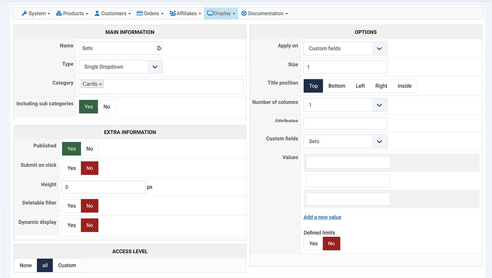 - The fact that you can't add values to the filter is normal. The filter automatically takes the values of the custom field. The values there can be used for other types of filters. For example, if you configure a filter on a custom field of the type "text" where you enter numbers in each product, you can enter values there so that the filter will display the choices as ranges. For now, you don't need to bother with this.