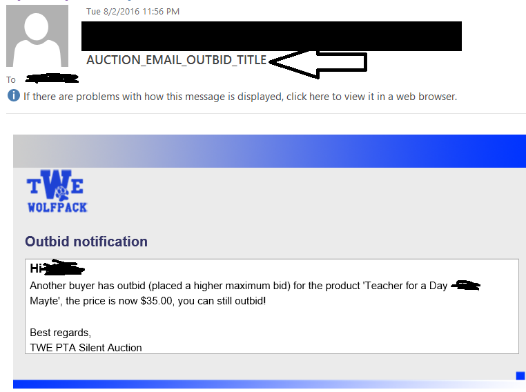 The email notifications that I'm getting for the outbid do not contain the actual title. It's in the language file correctly - as far as I can tell.