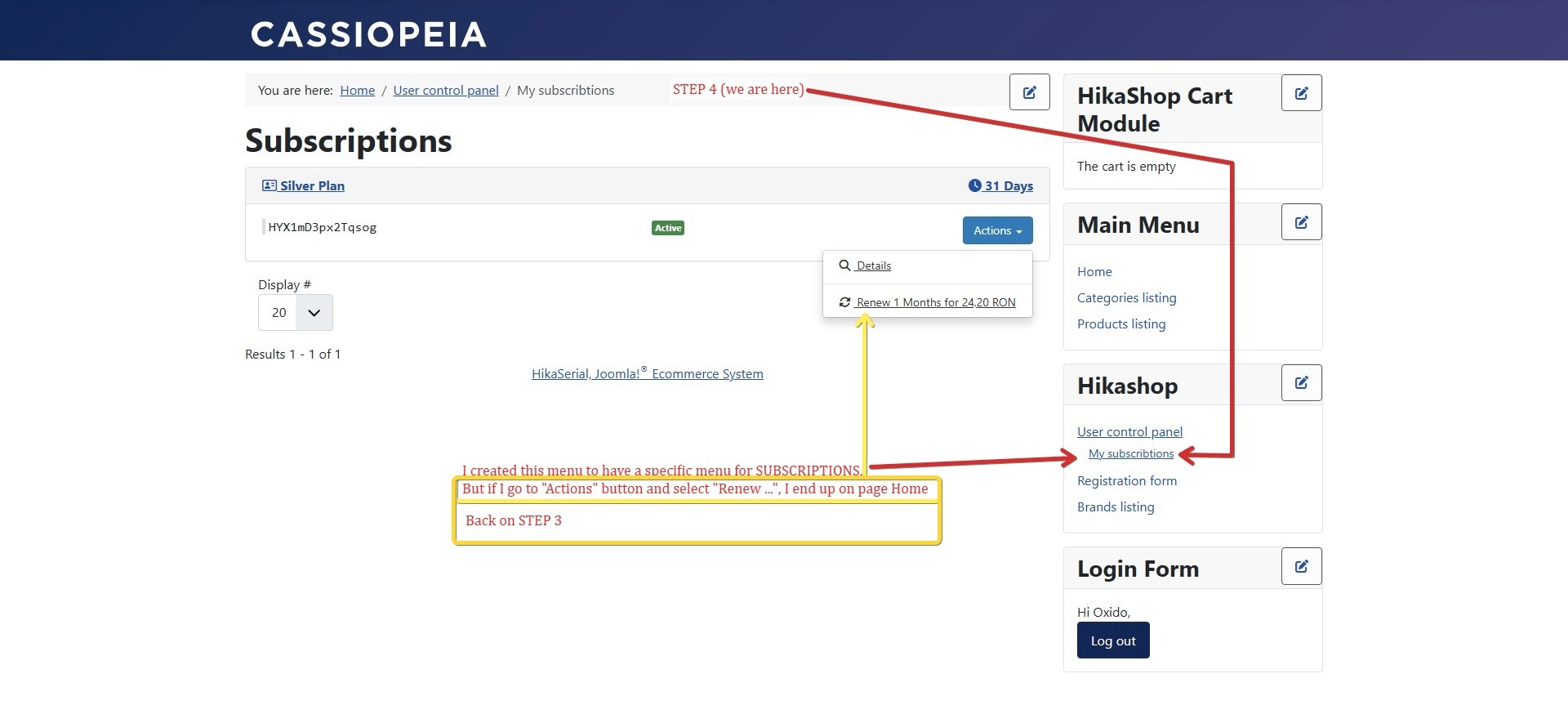 I've encountered an issue with the link to the Subscriptions section in the HikaShop user control panel.