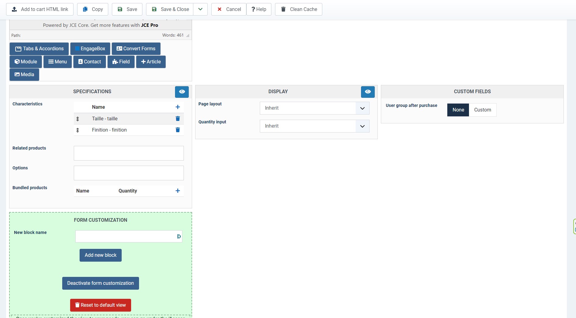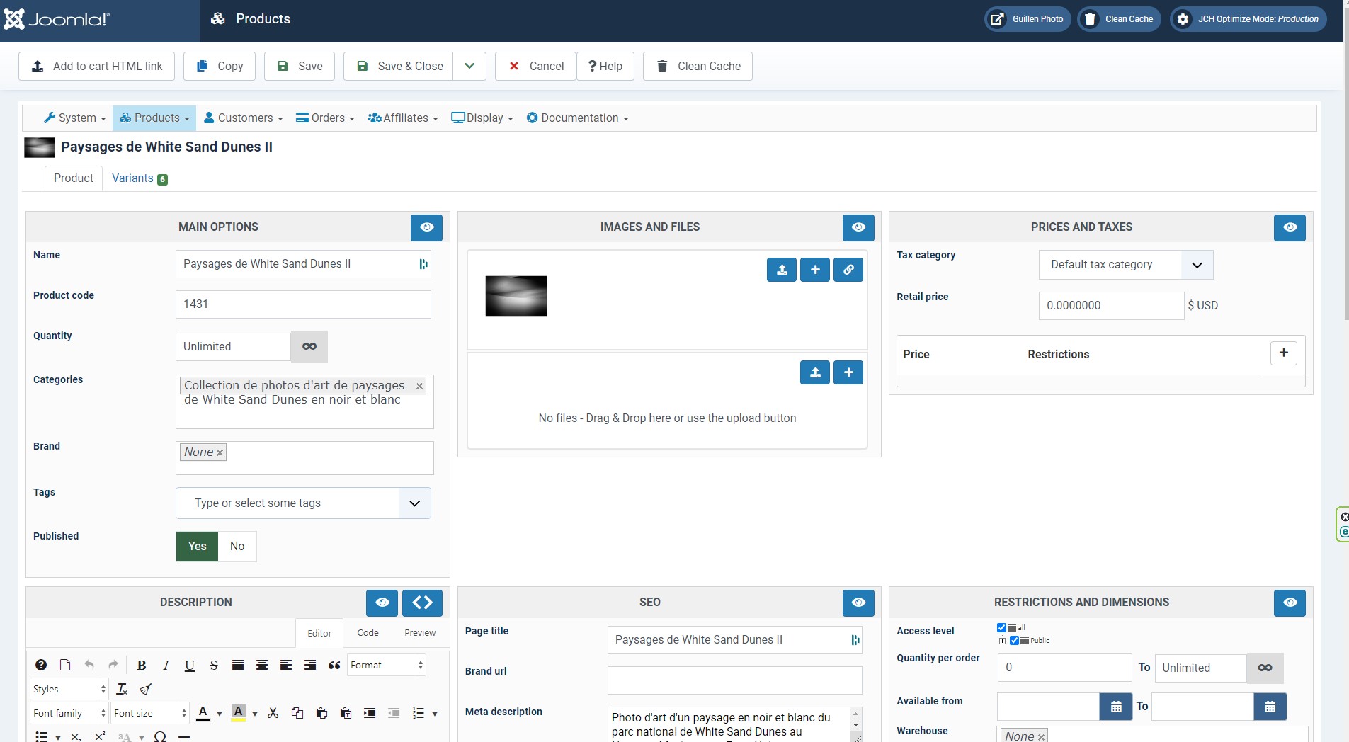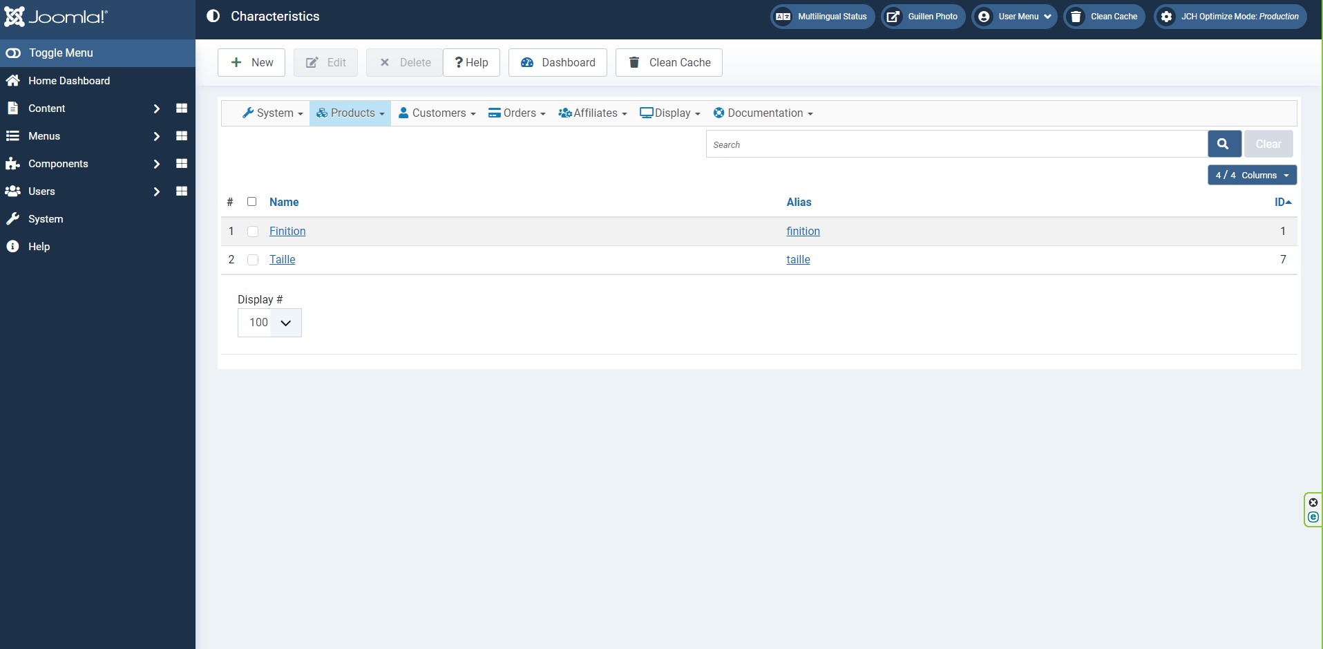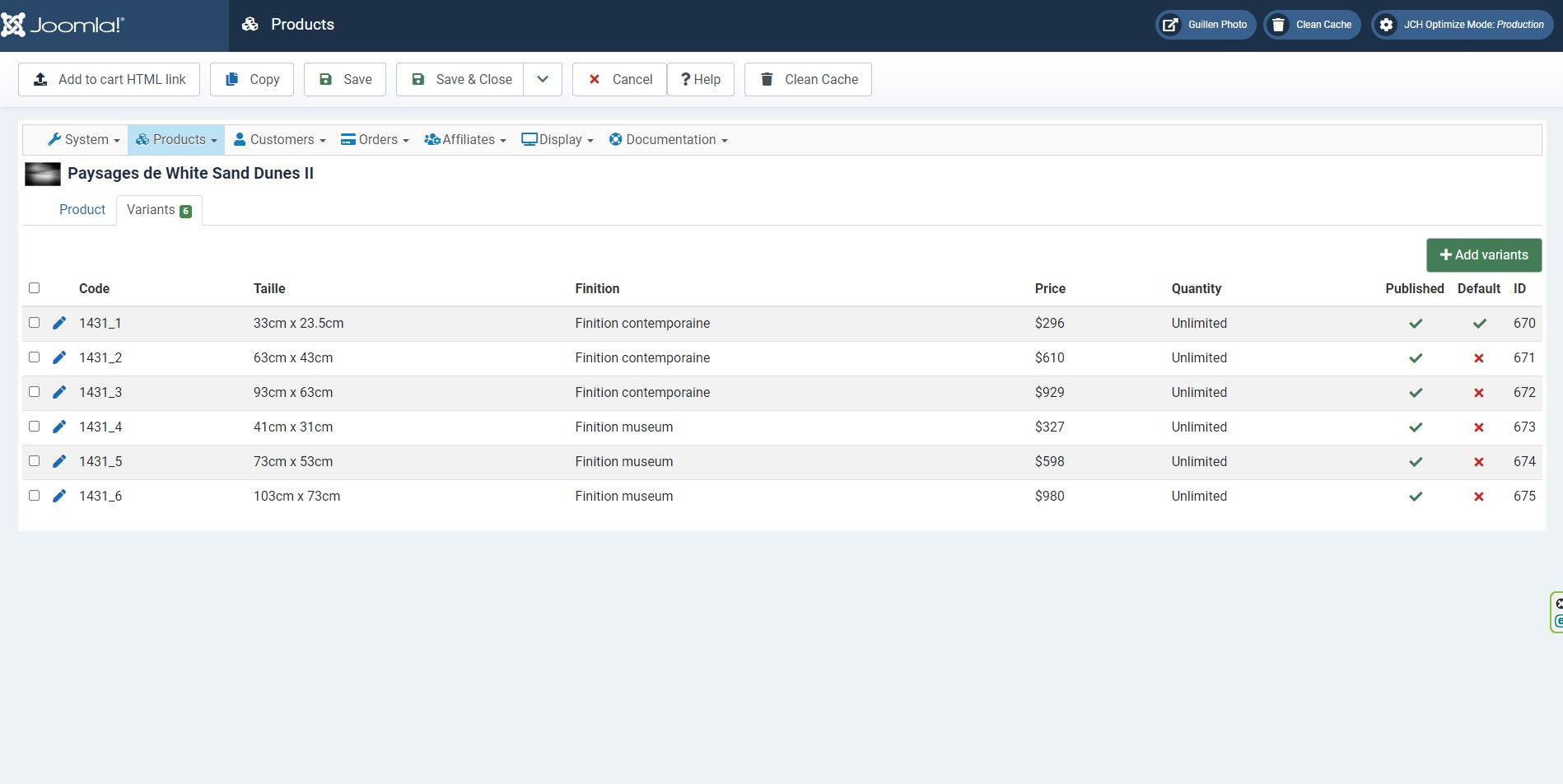 Chacun de mes produits possède deux caractéristiques : une finition et une taille.