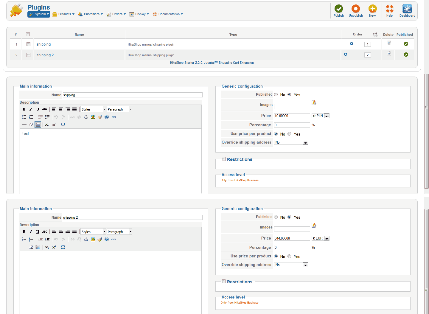 Hello. The thing is that: For payment I use "HikaShop bank transfer payment plugin". For delivery - "HikaShop manual shipping plugin". If more than 2 variants of delivery (for example: 1pc. - 2 rub; 2pcs. - 5rub.) then after order registration there is a message "thanks for the order" that's it! In the control panel of the order is not present both the message to the client and the administrator too is not present. If 1 variant of delivery, registration passes ideally - appears the message with bank details (which earlier filled in a plug-in) and messages are sent. How to implement 2 and more variants of delivery using only plugin "HikaShop manual shipping plugin"? In advance thanks!