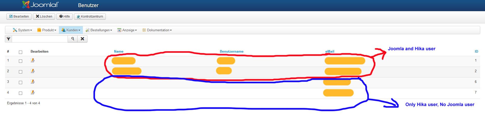 Yes if there is no username in the HikaShop user list, it means that you have an HikaShop user but not a Joomla one.