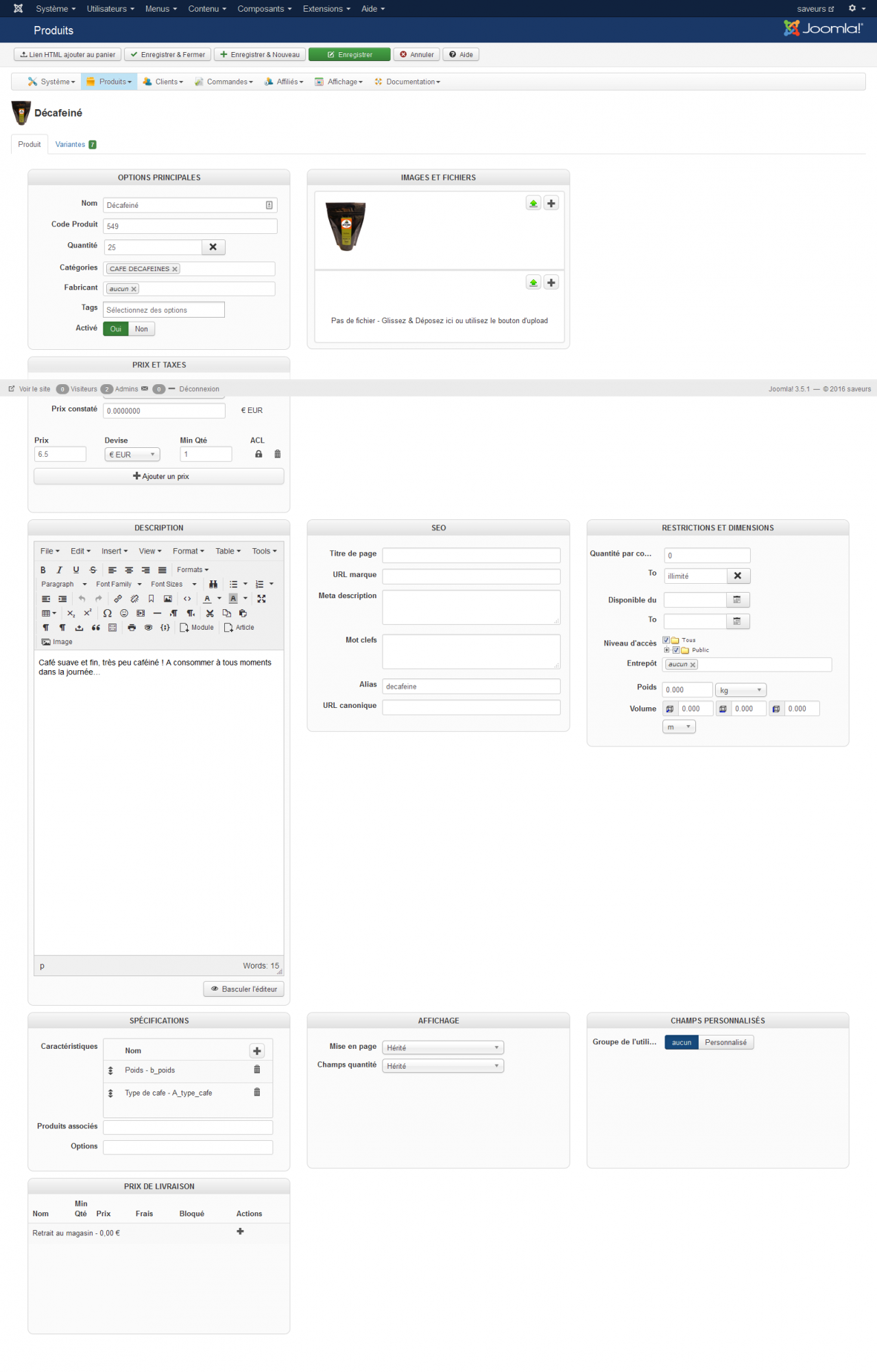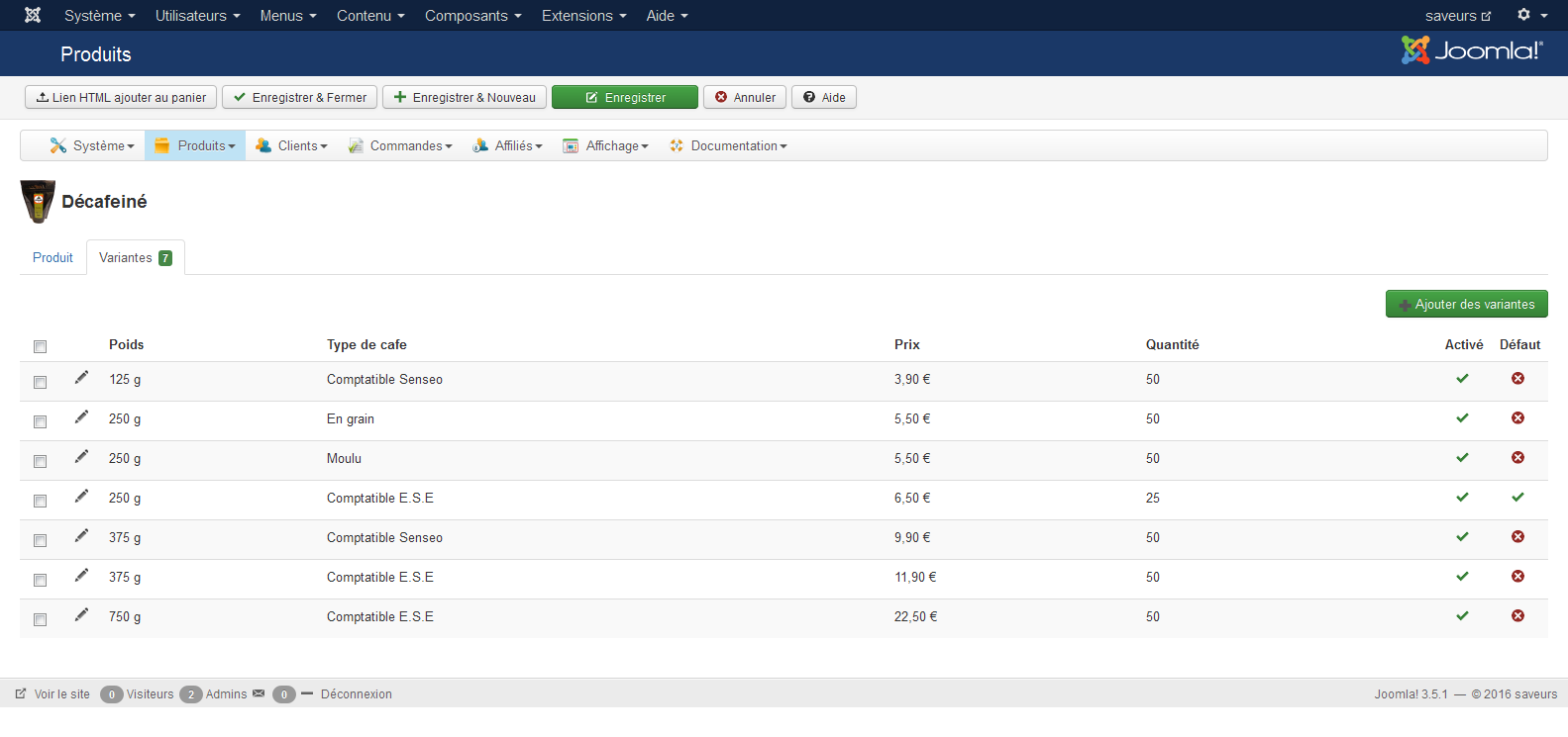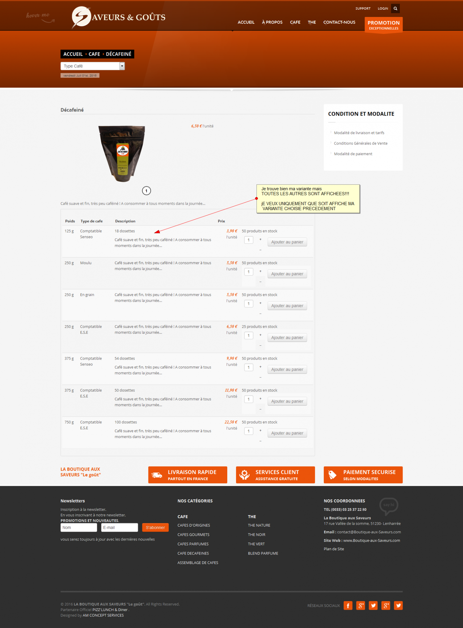 Pourquoi avoir des variantes sur vos produits pour le type de café ? Vous pourriez avoir seulement la caractéristique sur le poids et 4 produits différents pour chaque produit que vous avez actuellement.