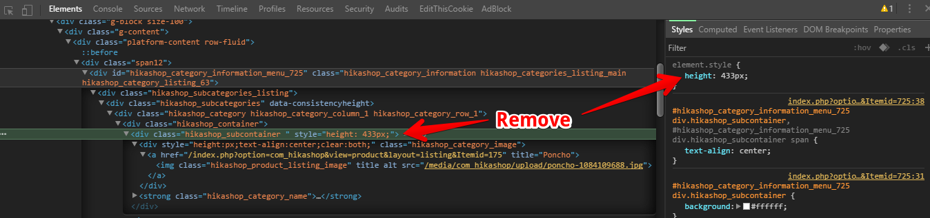 can you please tell me how can I remove the inline height added to the hikashop_subcontainer div on categories listing page?