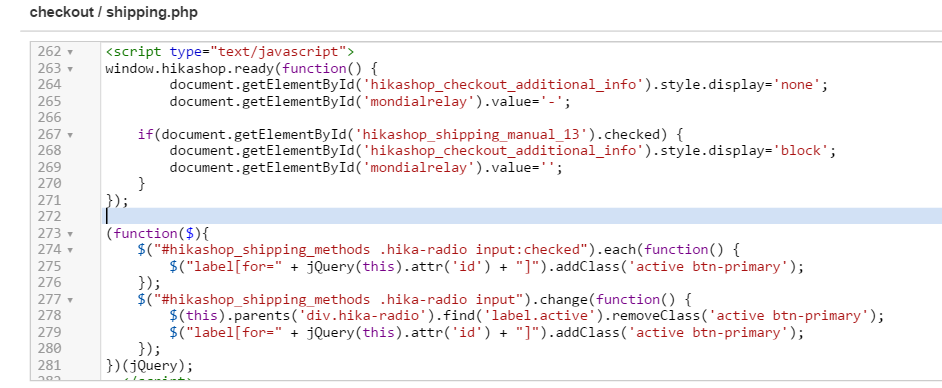 En effet j'ai plusieurs methodes de livraison (en boutique, colissimo,...) paramétré avec HikaShop manual shipping plugin. L'une d'élle est mondial relay. Je souhaiterais que le module du choix du relai ne s'affiche que si on sélectionne cette methode.