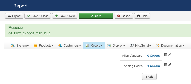 Another problem showed up, when I clicked the export option. As you can see Hikashop shows an error and no export is done.