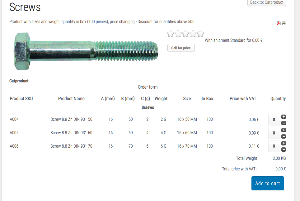 And in the HikaShop configuration, you can set the characteristic display method to "list" and the "add to cart on listing" to "global" and you'll get a similar display on the product page.