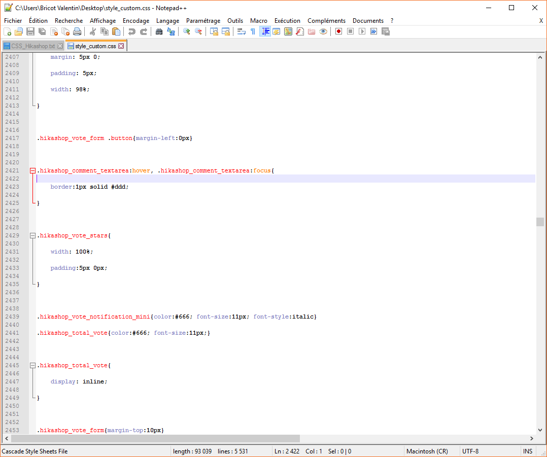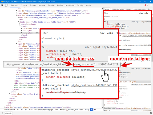 Si vous me suivez bien vous comprenez bien donc d'abord que vous n'avez pas besoin forcément de supprimer des lignes, à moins de vouloir "nettoyer" les fichiers css, donc voilà comment trouver chaque commande, son fichier css et sa ligne avec votre outil "inspector" :
