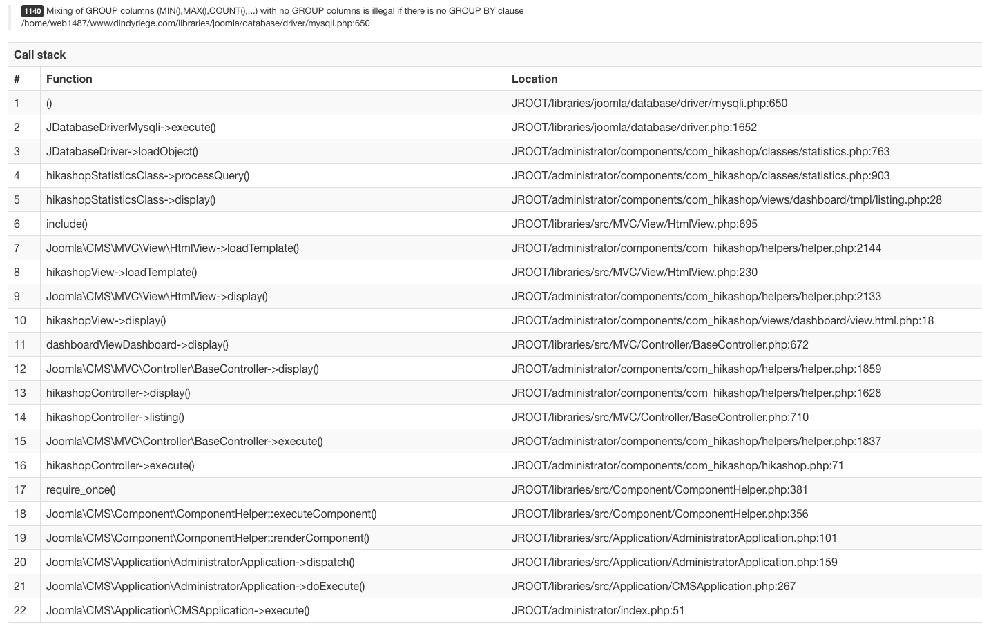 Mixing of GROUP columns (MIN(),MAX(),COUNT(),...) with no GROUP columns is illegal if there is no GROUP BY clause SELECT SUM(hk_order.order_full_price) as value, hk_order.order_currency_id as currency FROM c6l9m_hikashop_order AS hk_order WHERE (hk_order.order_type = 'sale') AND (hk_order.order_status IN ('confirmed','shipped')) AND (hk_order.order_invoice_created >= 1509321600 AND (1511999999 <= 0 OR hk_order.order_invoice_created <= 1511999999))