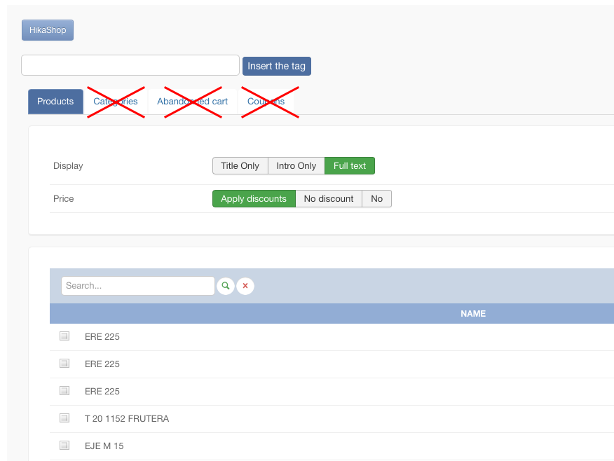 I jsut want my AcyMailing TAG interface to les introduce HikaShop products, nothing else.