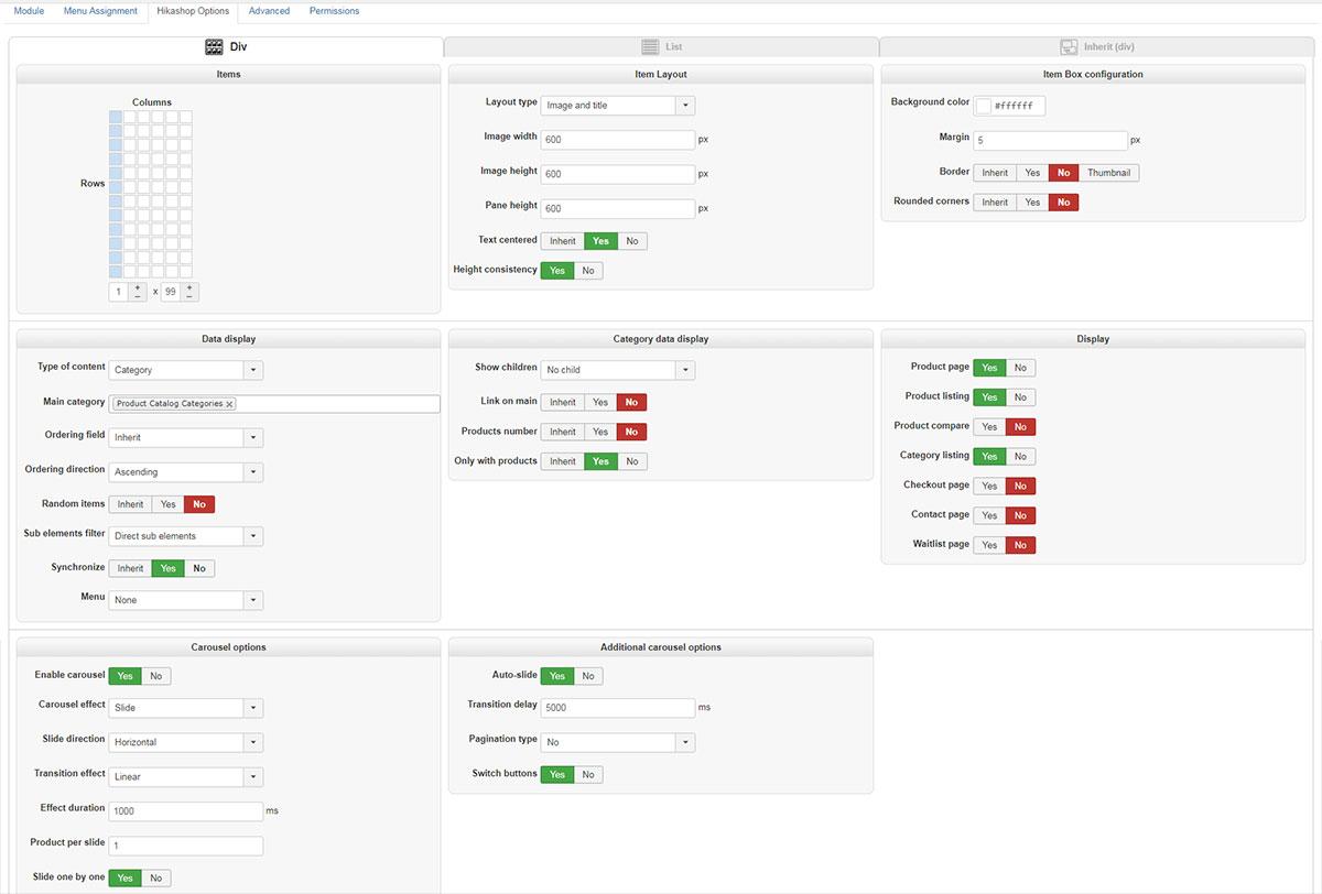 I am trying to configure a HikaShop Content Module to perform the following functions: