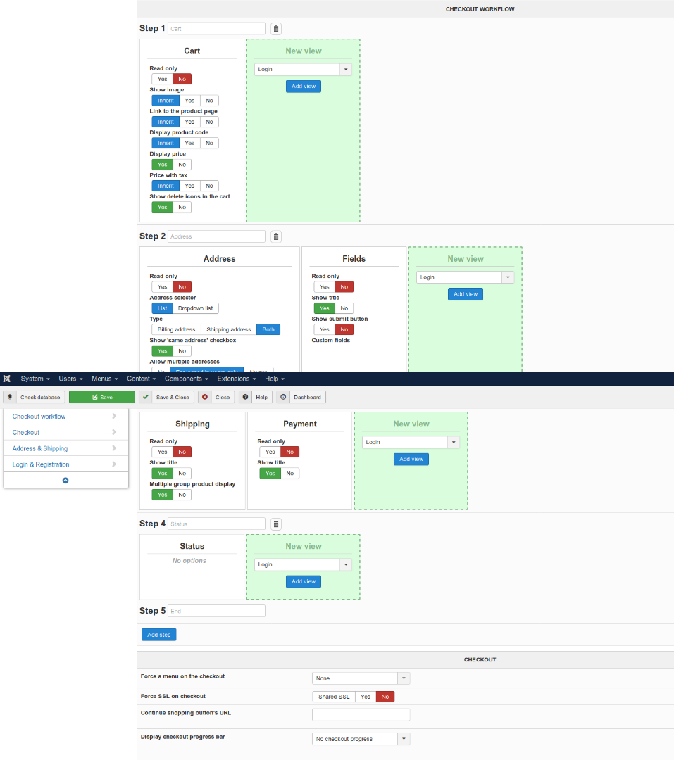 Even if you are using the "guest checkout", you must have a "login" block in your checkout workflow to let the customer provide its email address and access to the other "blocks" which require an account (even if it's a guest one), like "address".