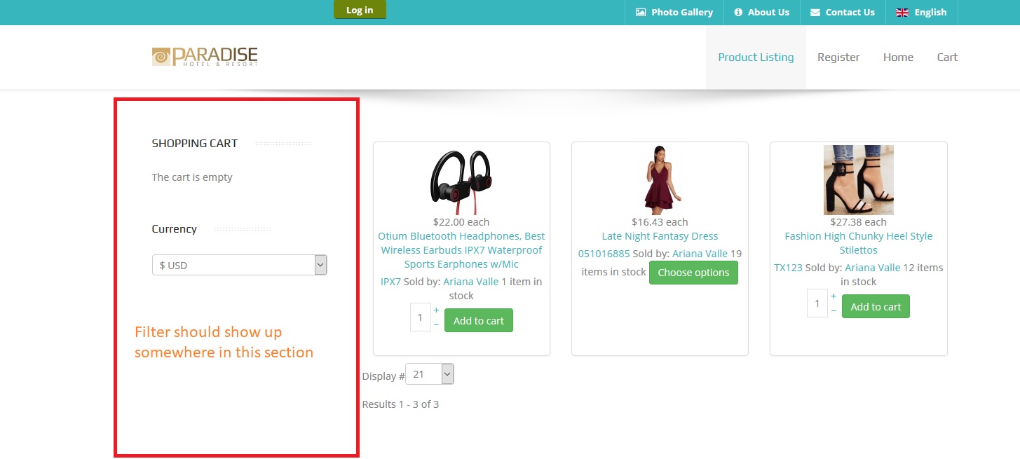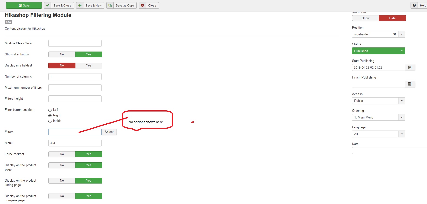 -- Error-message(debug-mod must be tuned on) -- : "HikaShop Filter Module" Does not show.