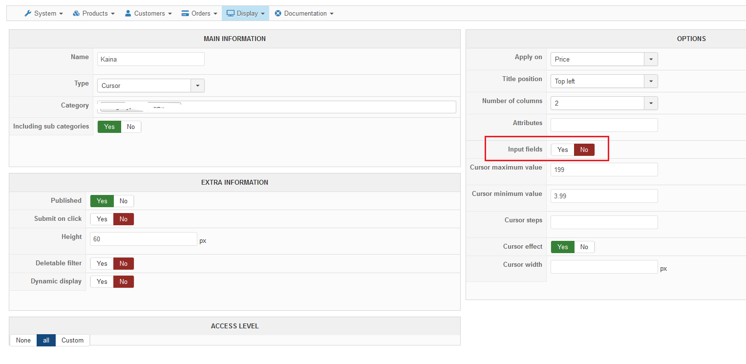 5. Filter type cursor, setting input fields to "YES" and saving, it wont save and goes back to "NO" after page refresh. Not sure what it does thought...