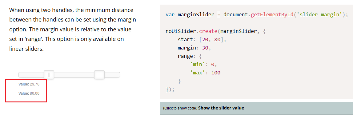 2. Input fields does work now but values are not updated dynamically when you move cursor? Also why it's input fields if basically user will use cursor for adjusting the values insteed of writing them directly into input fields? Why not just have values as per nouislider documentation?