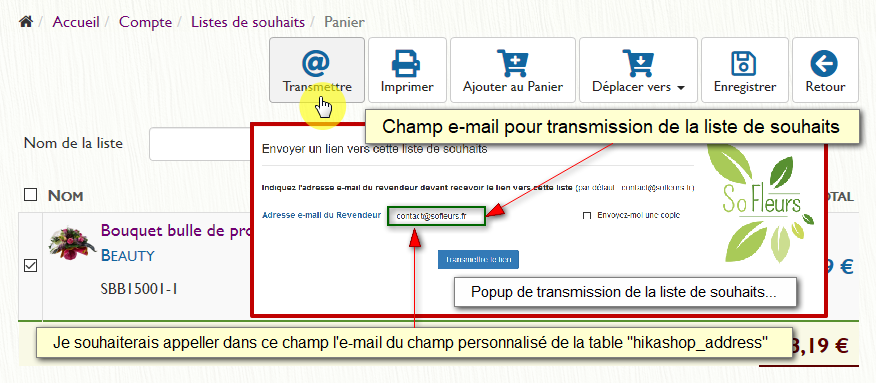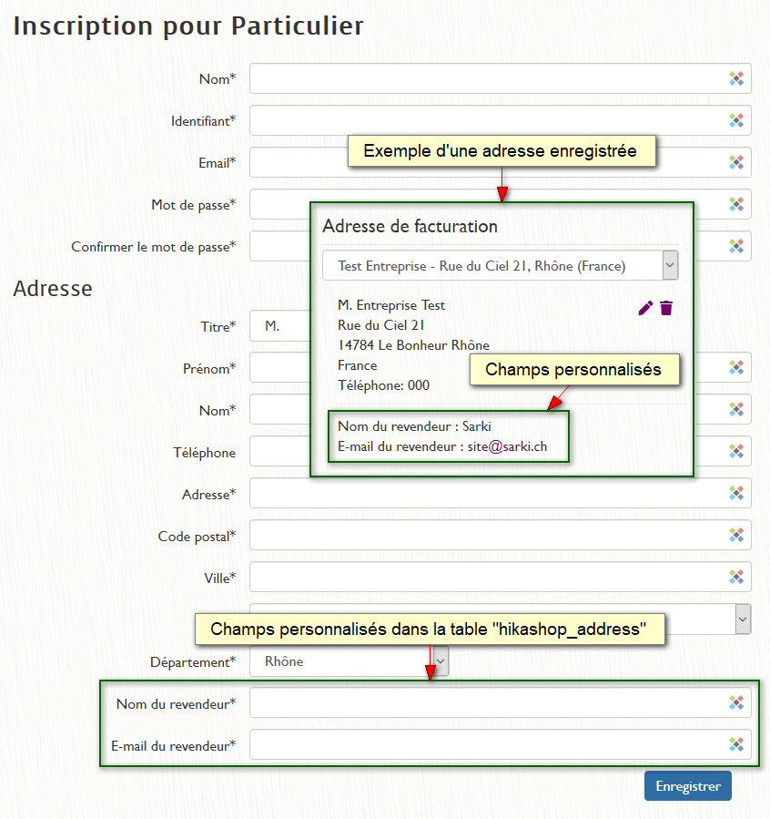 Notez que si l'utilisateur a plusieurs adresses vous aurez la valeur du champs personnalisé de l'adresse de facturation sélectionnée dans le panier courant, et à défaut, l'adresse de facturation par défaut de l'utilisateur avec ce code.