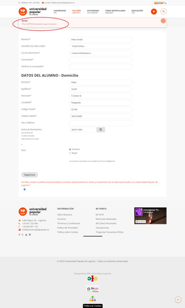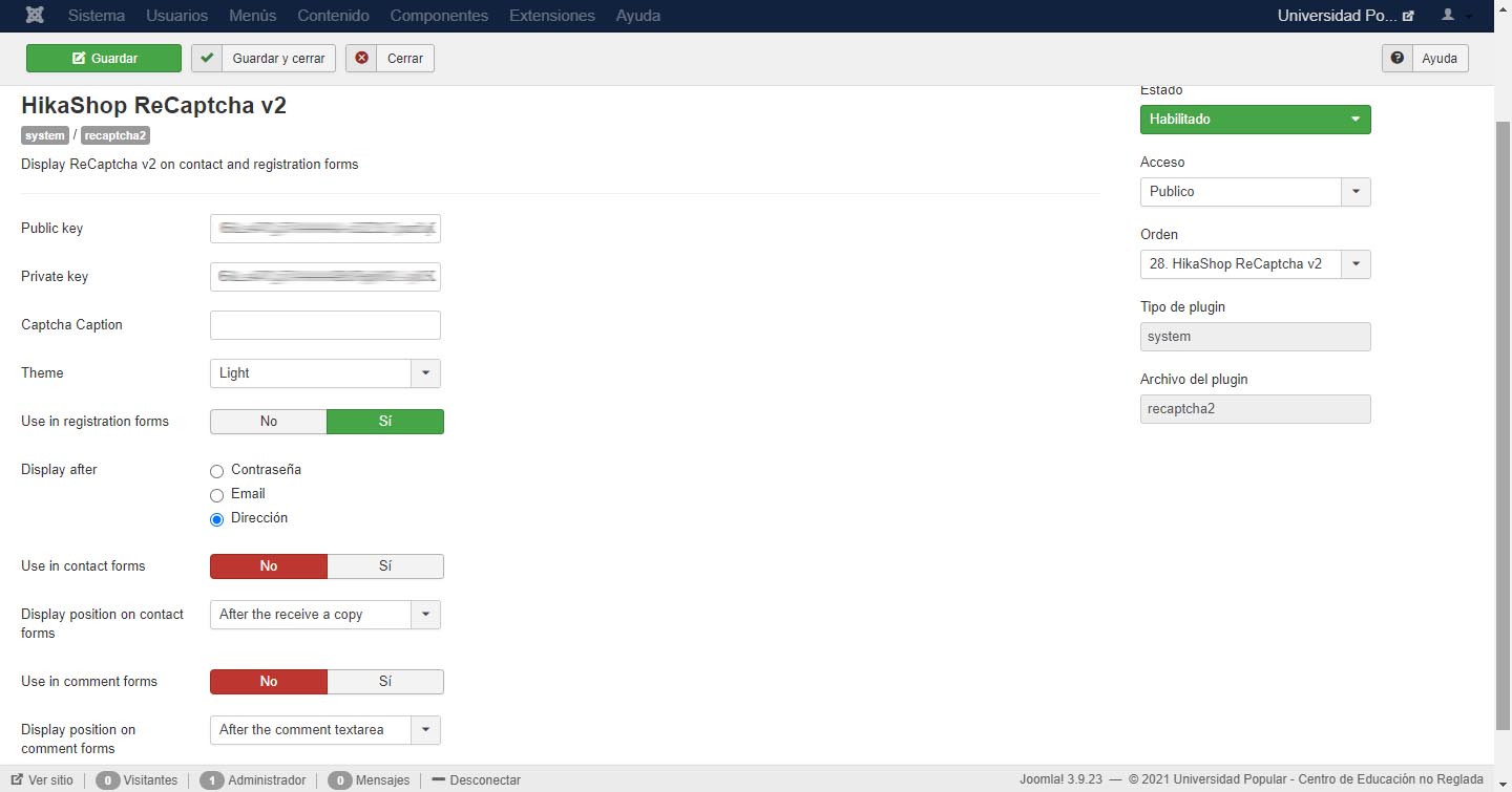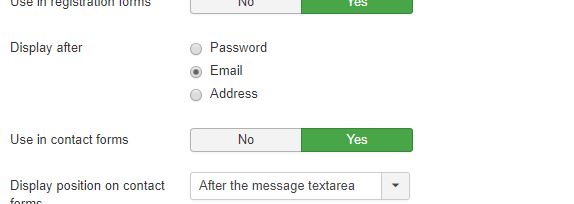 Note that if you configure the plugin to display the captcha after the address information and that you're using the Joomla registration form to create an account, then you won't see the captcha as there is no address information on that registration form.