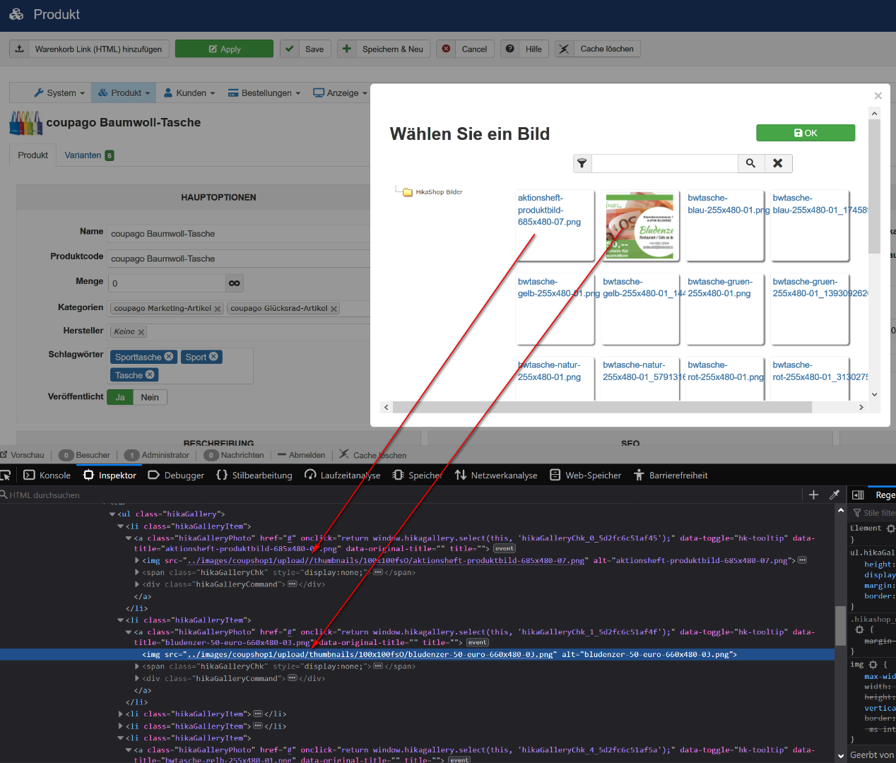 Again: Please look at the screenshots! I can't find out where the url is constructed. I think that there is the problem. The paths in configuration are correct. The images in shop frontend are shown. But the images in the popup when editing (adding or changing images) are not shown. And when I have a lot of images and I can see only part of the names of them, it is too hard to find some pics without to see it real.