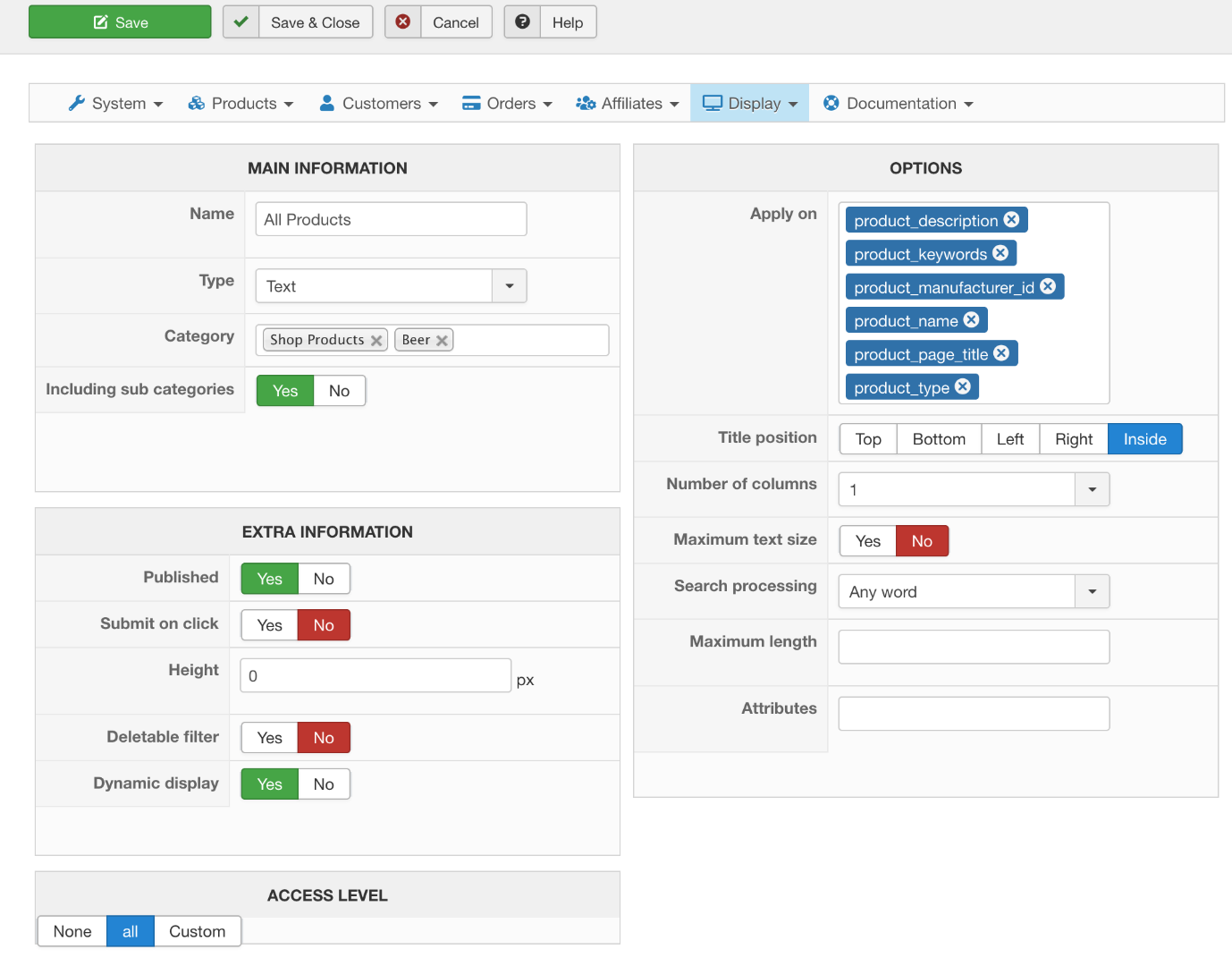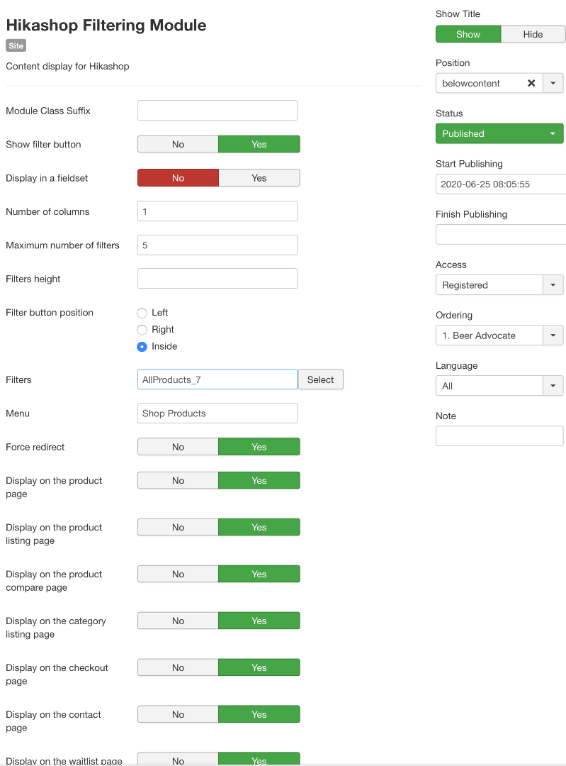 - Publish and configure the "HikaShop products search plugin" plugin through your plugin manager