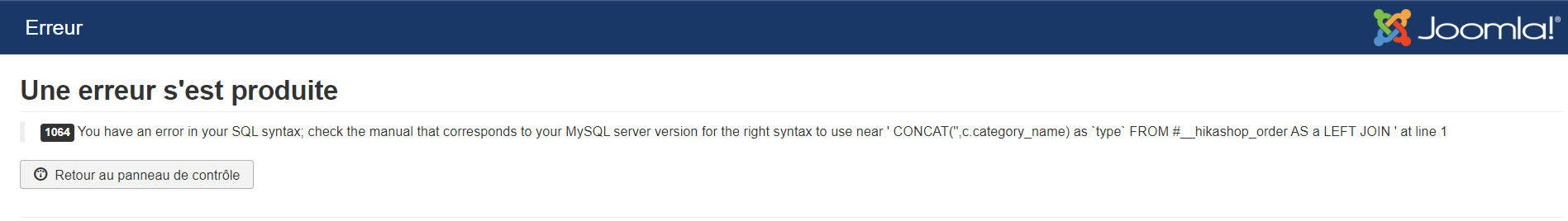 1064 You have an error in your SQL syntax; check the manual that corresponds to your MySQL server version for the right syntax to use near ' CONCAT('',c.category_name) as `type` FROM #__hikashop_order AS a LEFT JOIN ' at line 1