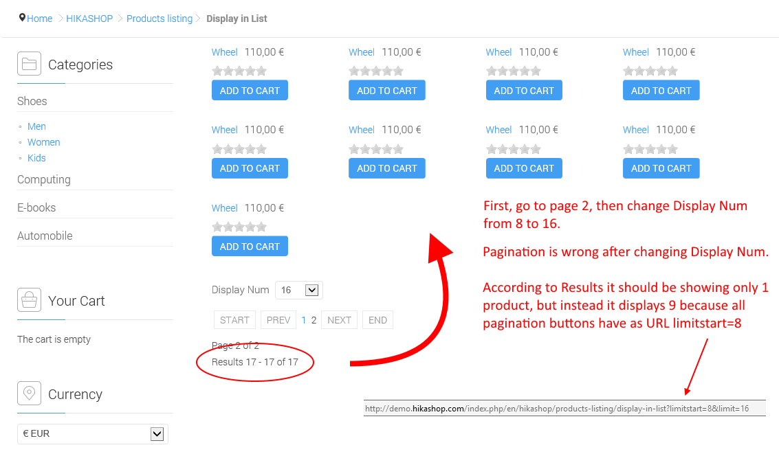 (I've already added &limitstart=0 to the link, but you can apply a filter on the right of the page if you want. As mentioned before however, this has nothing to do with filters, it also happens when disabling all filters or with a completely clean hikashop install without ever setting up any filters. The issue is just because of limitstart)