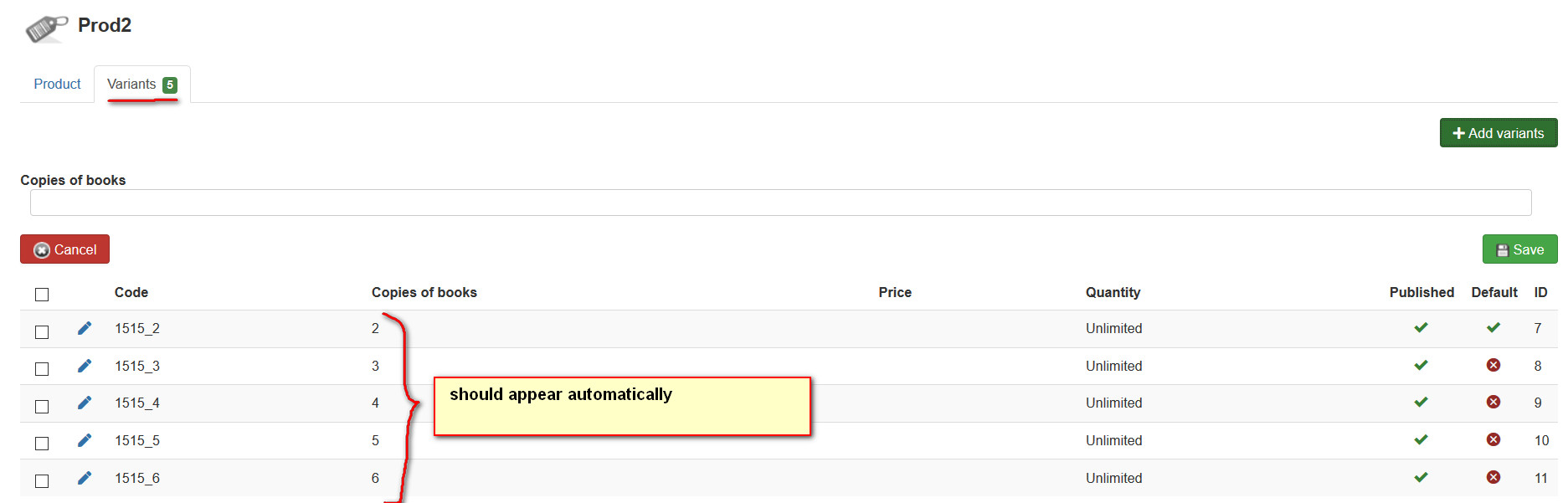 then the variants should appear (auto add) variants automatically as shown