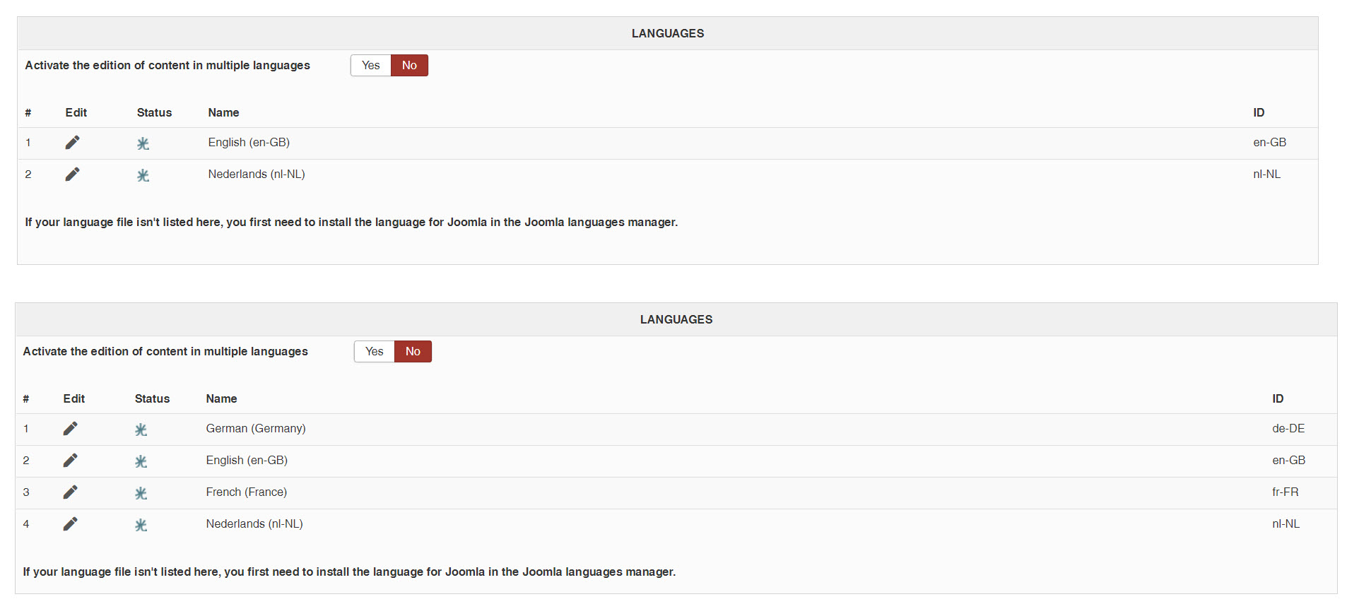 Both have more than two languages and turned of the option "Activate the edition of content in multiple languages". Also no Falang installed.
