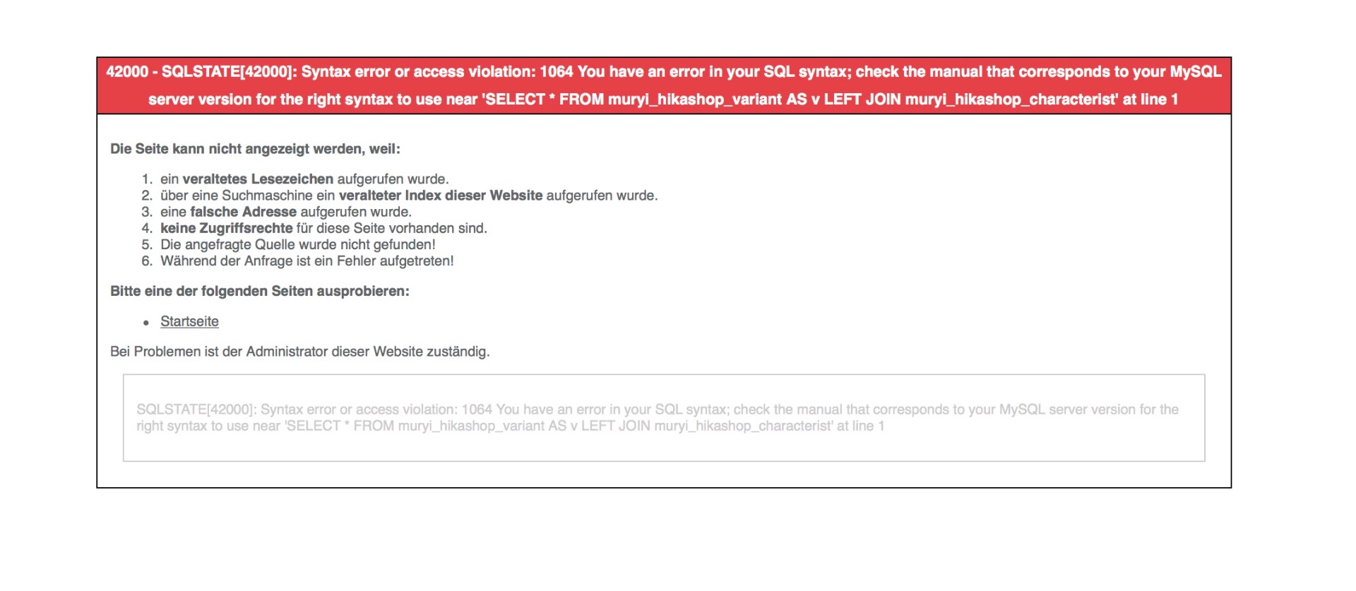 -- Error-message(debug-mod must be tuned on) -- : 42000 - SQLSTATE[42000]: Syntax error or access violation: 1064 You have an error in your SQL syntax; check the manual that corresponds to your MySQL server version for the right syntax to use near 'SELECT * FROM muryi_hikashop_variant AS v LEFT JOIN muryi_hikashop_characterist' at line 1