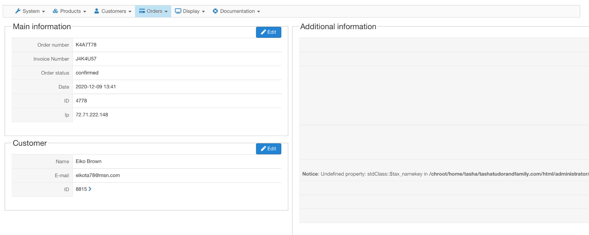For the backend, you can edit the file /administrator/components/com_hikashop/views/order/tmpl/show_additional.php and change the line: