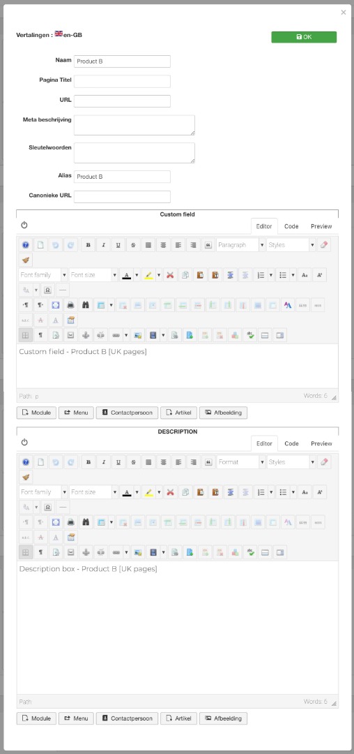 For design reasons I've added a custom field which loads just normal text content. When I use the translation flags to enter the English and Dutch content, on the English page the content of the custom field will only display the Dutch content. All content of the description box is displayed correctly.