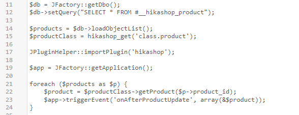 $db->setQuery("SELECT * FROM #__hikashop_product');