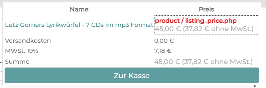 - You could modify the code of product / cart.php via the menu Display>Views and remove the code:
