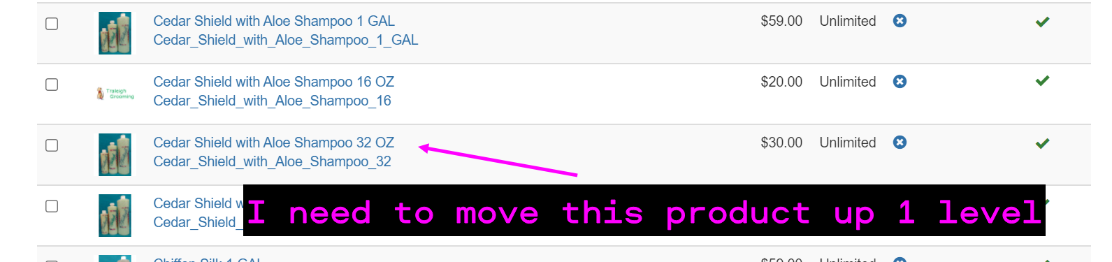 Then, under the "order" column of the listing, you'll see an input field with arrows for each product to reorder the products.