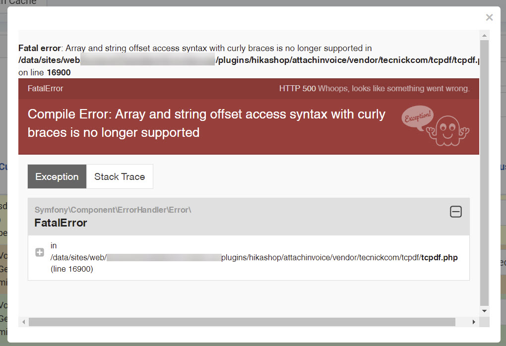 Fatal error: Array and string offset access syntax with curly braces is no longer supported in /.........../plugins/hikashop/attachinvoice/vendor/tecnickcom/tcpdf/tcpdf.php on line 16900