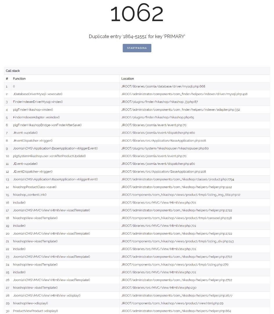 The error comes from an indexing issue with a MySQL query in the smart search component of joomla.