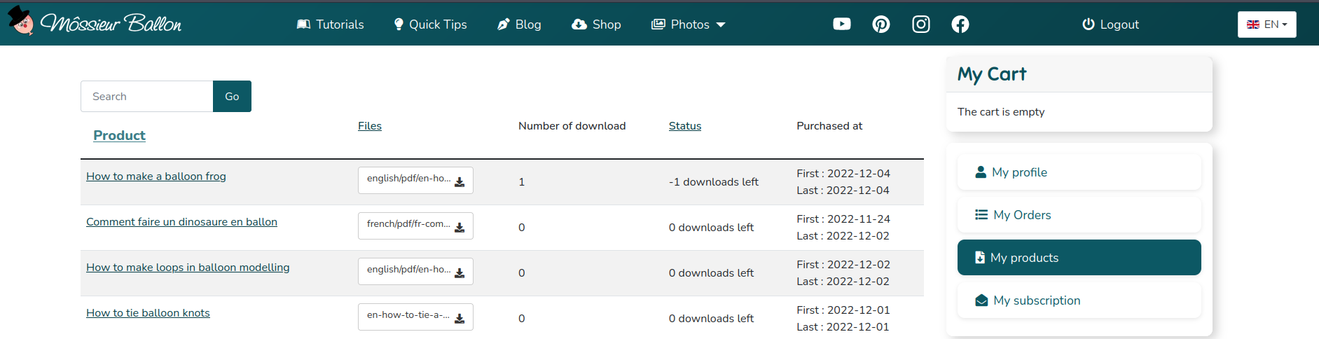 In the case of unlimited download for digital products, the downloaded products personal page for users who downloaded digital products shows negative numbers of downloads left under the status column.