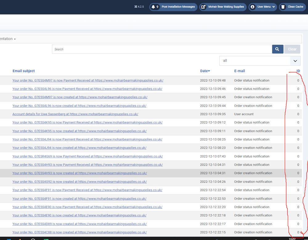 See attached. ALL emails sent to customers are blank in the email history? no id is being set all showing 0?